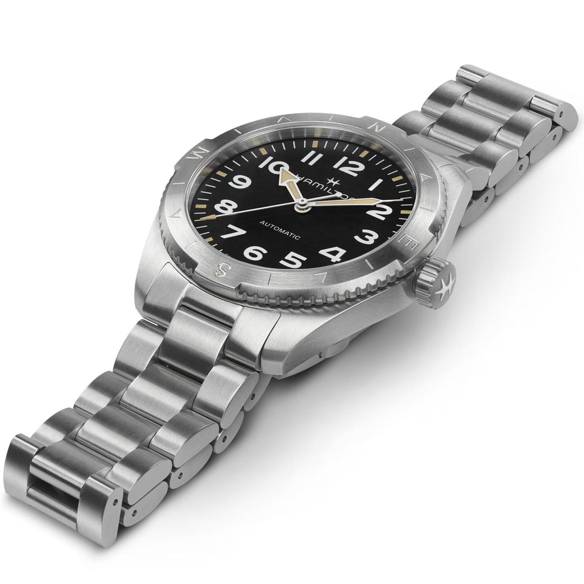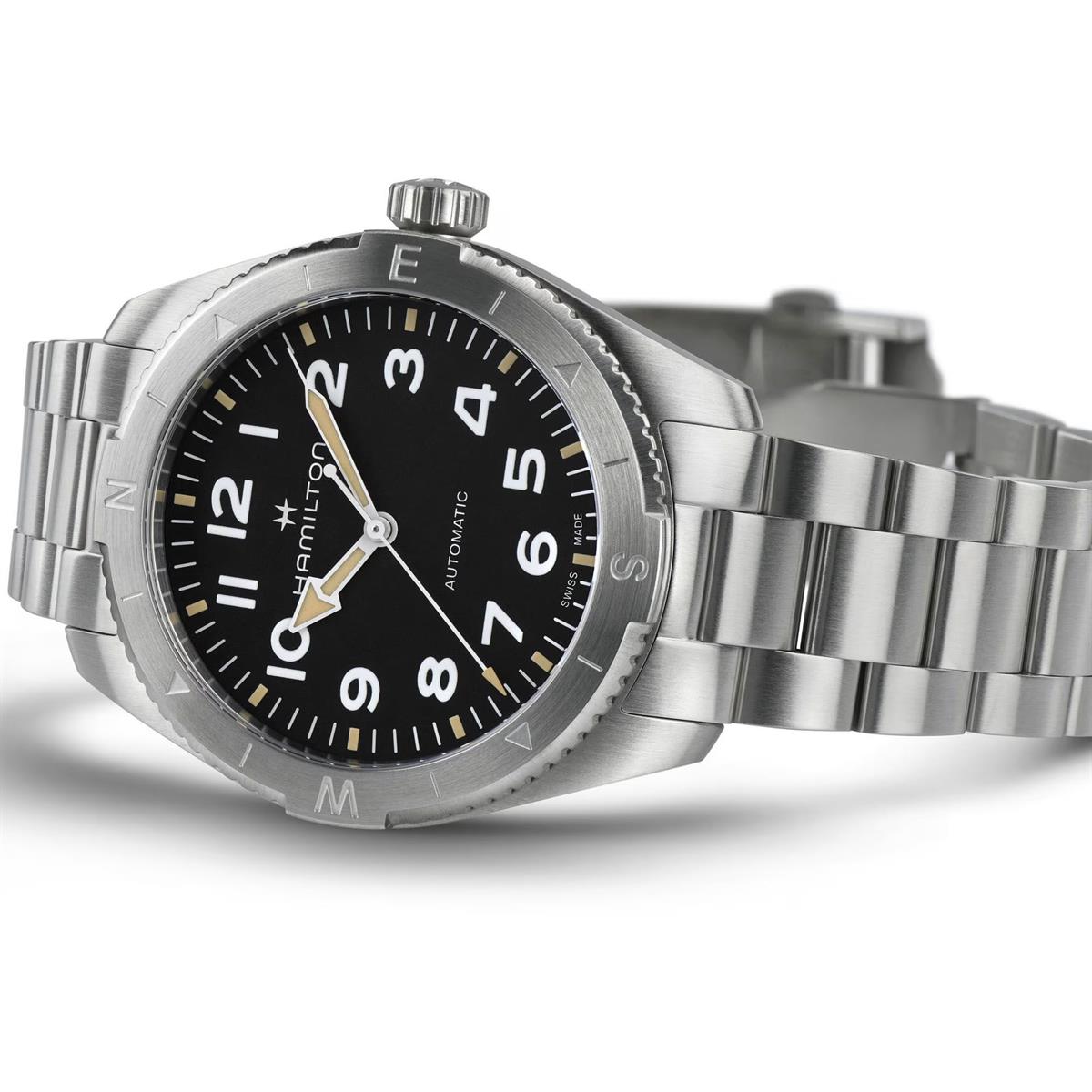 Prepárate para tus actividades al aire libre con el Khaki Field Expedition, un reloj de aventura todoterreno con un diseño de brújula que te permite proseguir la aventura con la ayuda del sol. Se alberga en una caja de acero inoxidable de 41 mm junto con un brazalete a juego, y está equipado con una corona atornillada para proteger el movimiento contra las inclemencias del tiempo. El Khaki Field Expedition, dotado de una esfera negra texturizada con revestimiento de Super-Luminova® para conseguir la máxima legibilidad, te ofrece la resistencia que necesitas.