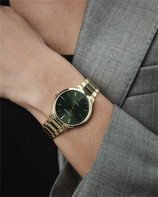 Reloj caja de acero Ip dorado 5 Atm, brazalete de acero Ip dorado, movimiento cuarzo Suizo, Swiss made