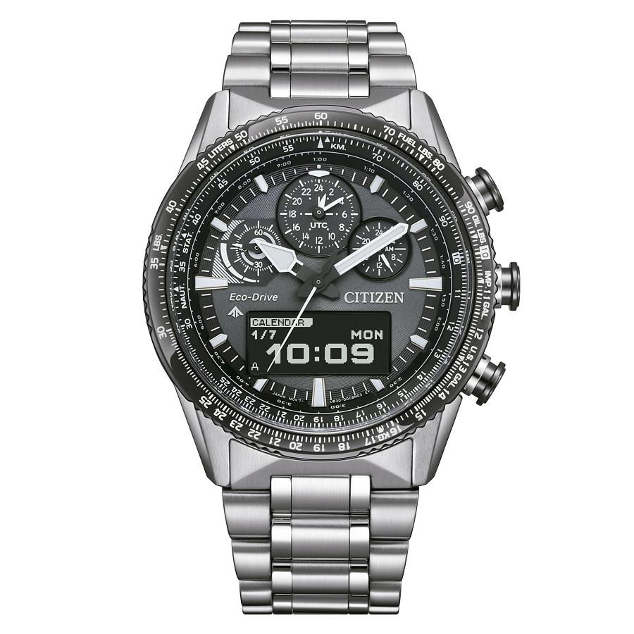 Sección analógica: hora, minuto, segundo, reloj 24 horas, UTC. Cronógrafo (minutos, segundos). Sección digital: hora, minuto, segundo, huso horario. Calendario: año, mes, fecha, día de la semana. Cronógrafo. World Time: 43 áreas, incluidos 29 husos horarios. Timer 99 minutos. Indicador Ligh-Level. 2 alarmas. Perpetual calendar hasta 31/12/2199. Indicador nivel de carga batería Eco-Drive. Funciones: prevención de sobrecarga, aviso de carga insuficiente, asignación de la diferencia horaria, detección de impactos. Selección de idioma. Luz LED.