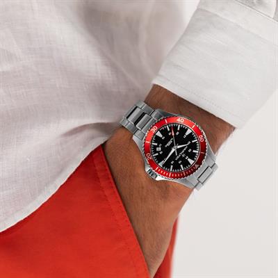El Khaki Navy Scuba Automatic de 40 mm destaca por su bisel de aluminio rojo con acabado arenado, proporcionando un tono más suave y profundo con un brillo sutil. El rojo brillante, inspirado en el universo marino, recuerda a los llamativos equipos de rescate oceánicos y la señalización de babor en los veleros. Impulsado por nuestro movimiento automático H-10, este reloj es la elección perfecta para quienes valoran tanto el estilo como la funcionalidad. La atractiva paleta de rojos añade un toque único, convirtiendo al Khaki Navy Scuba en un compañero atemporal, listo para cualquier desafío, desde exploraciones acuáticas hasta aventuras urbanas.