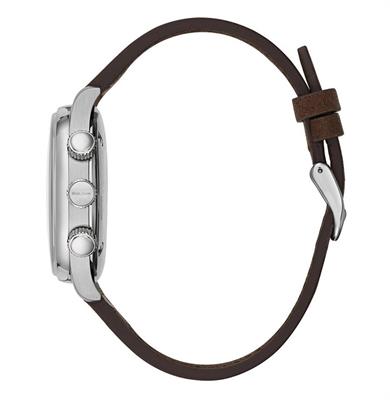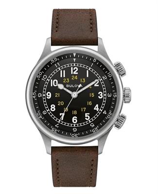 Reloj Bulova 96A245 hombre colección Military inspirado en el reloj Military Issue. Caja de acero con correa de piel marrón. 42 milímetros de diámetro, grueso de 14 milímetros. Esfera en negro con discos internos giratorios operados con las dos coronas, la corona en la posición de las 2 gira indicando el tiempo transcurrido y la corona en la posición de las 4 indica la hora dual. Cristal de zafiro con tratamiento antirreflectante. Automático, 21600 alternancias por hora, 6 golpes por segundo, 21 rubíes. Con capacidad de cuerda manual y reserva de marcha de 42 horas aproximadamente. Resistente al agua 30 metros. Estuche y garantía oficial Bulova.