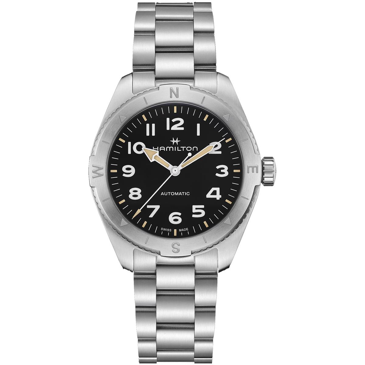 Prepárate para tus actividades al aire libre con el Khaki Field Expedition, un reloj de aventura todoterreno con un diseño de brújula que te permite proseguir la aventura con la ayuda del sol. Se alberga en una caja de acero inoxidable de 41 mm junto con un brazalete a juego, y está equipado con una corona atornillada para proteger el movimiento contra las inclemencias del tiempo. El Khaki Field Expedition, dotado de una esfera negra texturizada con revestimiento de Super-Luminova® para conseguir la máxima legibilidad, te ofrece la resistencia que necesitas.